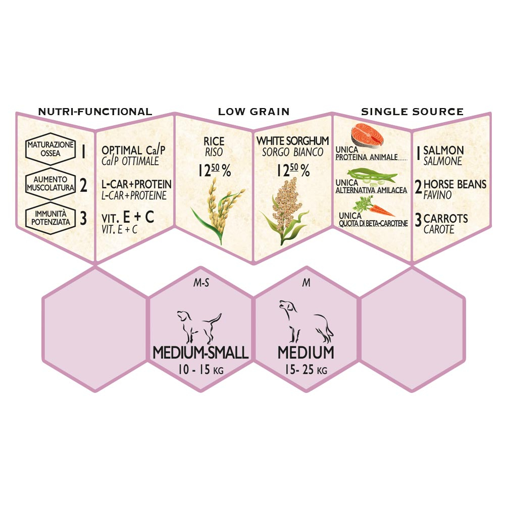 Crocchette funzionali per cuccioli di taglia MEDIUM-SMALL e MEDIUM, indicate per definire la crescita sicura.