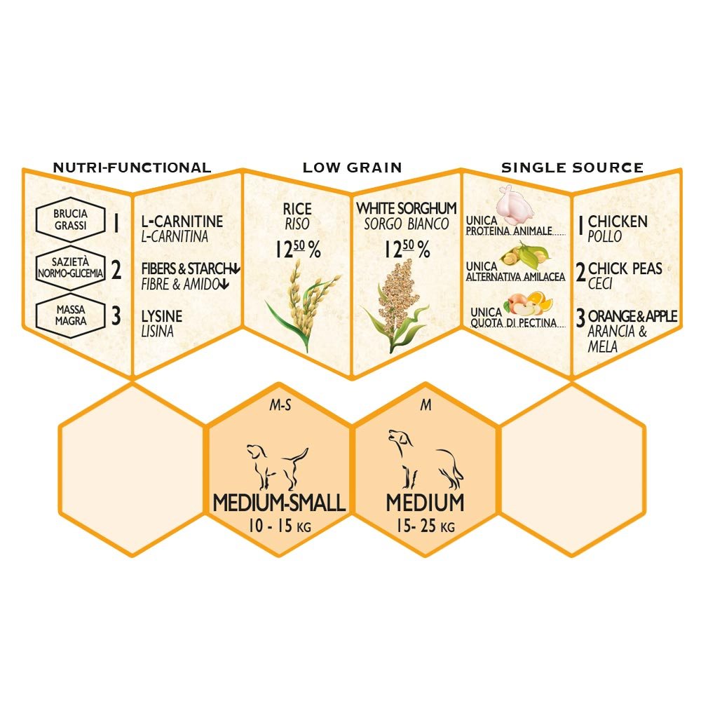Proteine di pollo disidratate (24%), ceci* (18%), riso (12,5%), sorgo bianco* (12,5%), proteine animali idrolizzate, fibra di piselli, polpa di barbabietola essiccata (6%), olio vegetale, grasso animale, polpa di mele essiccata (1%), polpa di arancia essiccata (1%), carote essiccate, polpa di pomodori essiccata, olio di pesce, miele (0,04%), fiori di arancio essiccati (0,02%). *fonte di amido a basso indice glicemico.