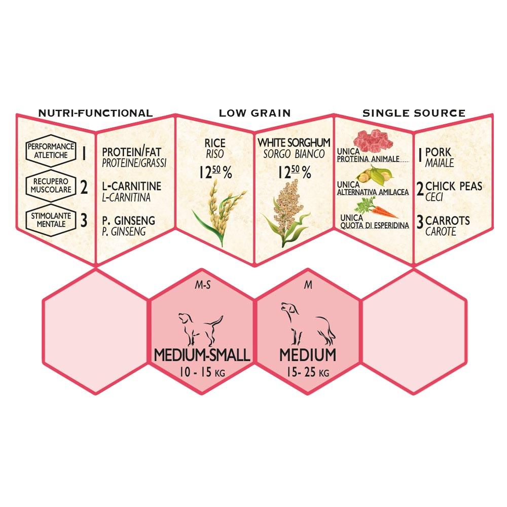Crocchette funzionali per cani adulti di taglia MEDIUM-SMALL e MEDIUM, indicate per irrobustire l'architettura muscolare.