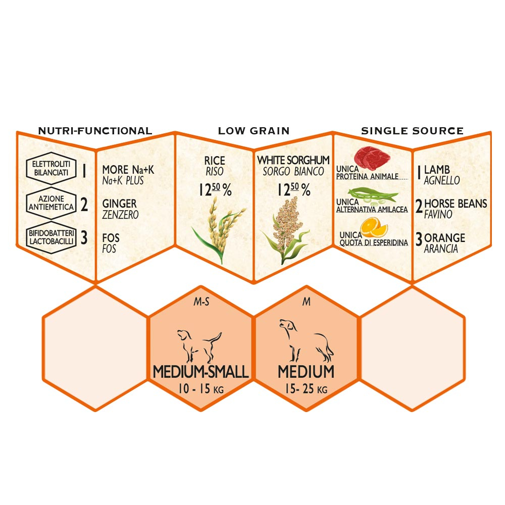 Favino (34%), proteine di agnello disidratate* (14%), riso* (12,5%), sorgo bianco (12,5%), grasso animale, polpa di barbabietola essiccata, lievito di birra, proteine animali idrolizzate, fruttoligosaccaridi (1%), polpa di arancia essiccata (1%), carote essiccate, polpa di mele essiccata, polpa di pomodori essiccata, cloruro di sodio, radice di zenzero (0,3%), cloruro di potassio, miele (0,04%), fiori di arancio essiccati (0,02%). *ingrediente ad elevata digeribilità.