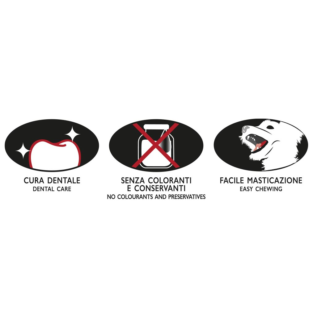 Lo snack presta attenzione alla cura dentale, senza coloranti e conservanti artificiali. È facilmente masticabile anche dai cani con le fauci più piccole.