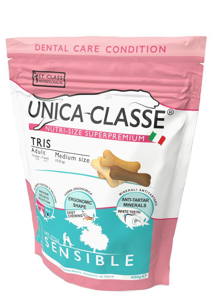 Snack Fisiologico adatto per cani adulti (12 mesi - 7 anni di età) di taglia media, con peso compreso tra 10 e 25 kg.