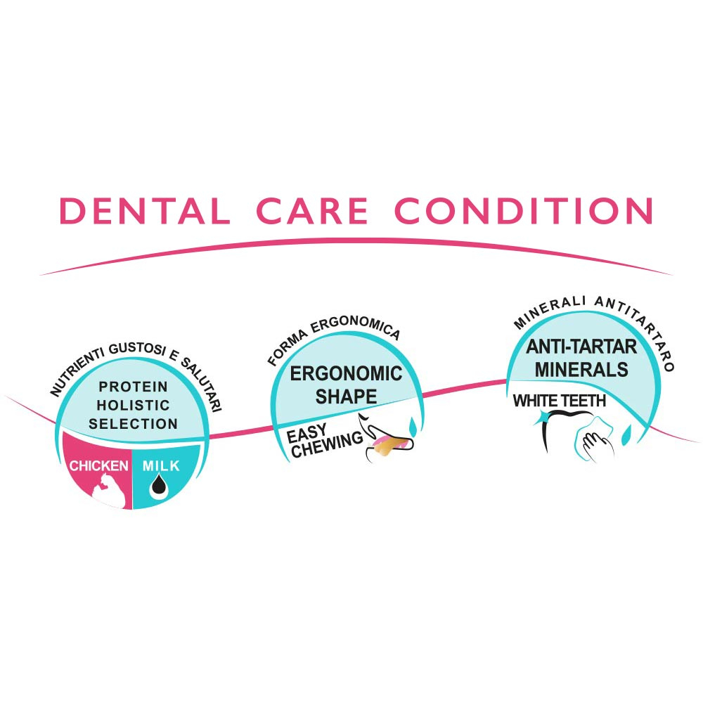 Sono contenute le proteine di Pollo e del Latte per offrire il massimo del nutrimento e del gusto, oltre che uno specifico minerale ad azione anti-tartaro. Inoltre, la forma ergonomica facilita la masticazione.