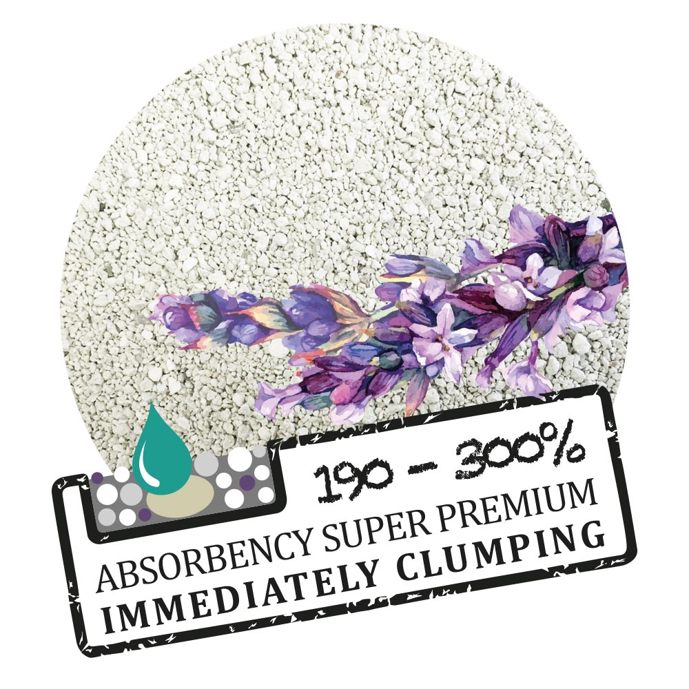La particolare granulometria molto fine, ma a ridottissima polverulenza (<1%), consente di formare in pochissimi secondi piccole palle compatte, che rilasciano un fresco profumo di lavanda e riducono significativamente i cattivi odori. Inoltre essendo le palle estremamente piccole e molto compatte sono molto facili da smaltire e riducono al limino di spechi di lettiera.