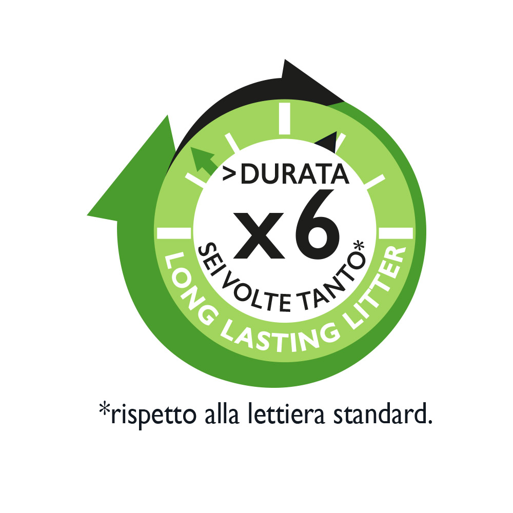 Lettiera ad elevato potere assorbente (fino al 300%) per la massima resa, che assicura una durata fino a 6 volte maggiore rispetto ad una lettiera standard.