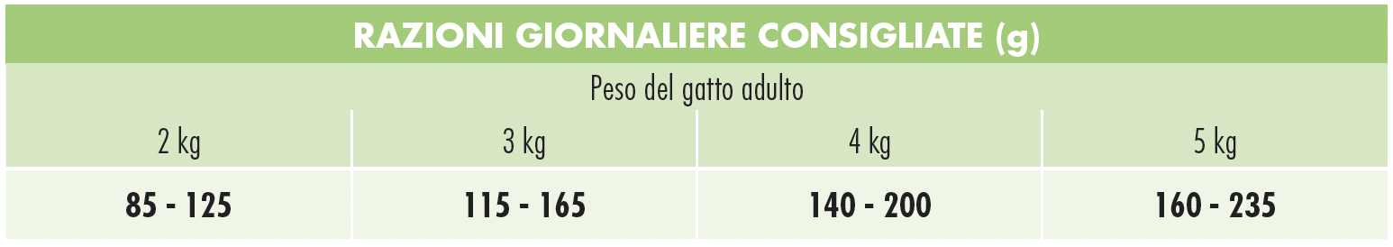 UNICA NATURA - ADULT SFILACCETTI DI TONNO CON GAMBERETTI I razionamenti indicati in tabella possono variare in base all'età, alla razza, all'attività o alla stagione e dovrebbero essere divisi in 2 pasti al giorno.