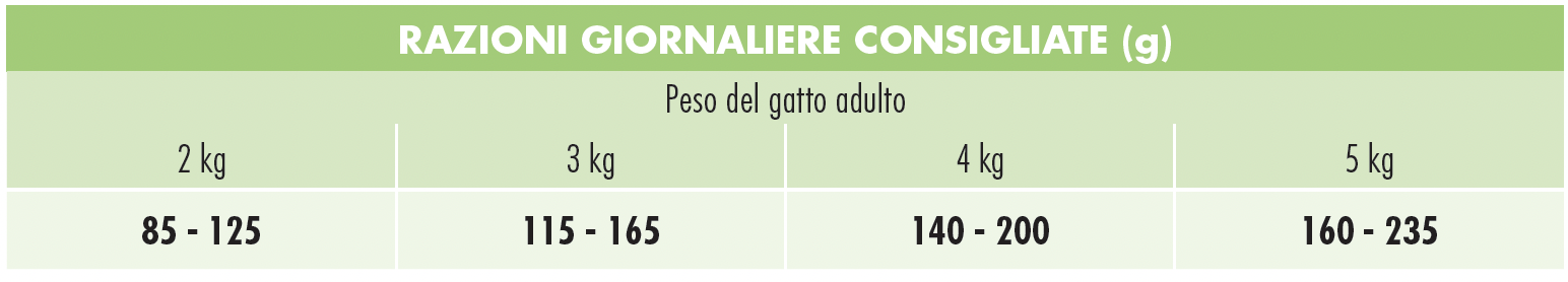 UNICA NATURA - ADULT SFILACCETTI DI TONNO CON PISELLI I razionamenti indicati in tabella possono variare in base all'età, alla razza, all'attività o alla stagione e dovrebbero essere divisi in 2 pasti al giorno.