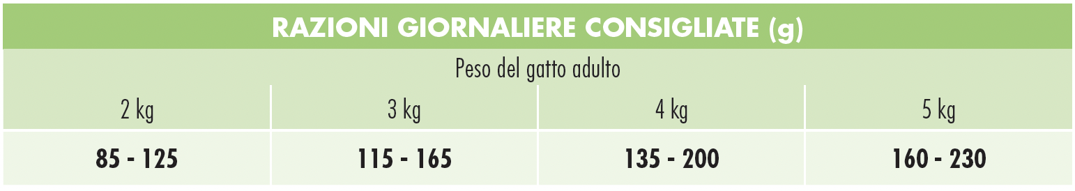 UNICA NATURA - ADULT SFILACCETTI DI TONNO CON SALMONE I razionamenti indicati in tabella possono variare in base all'età, alla razza, all'attività o alla stagione e dovrebbero essere divisi in 2 pasti al giorno.